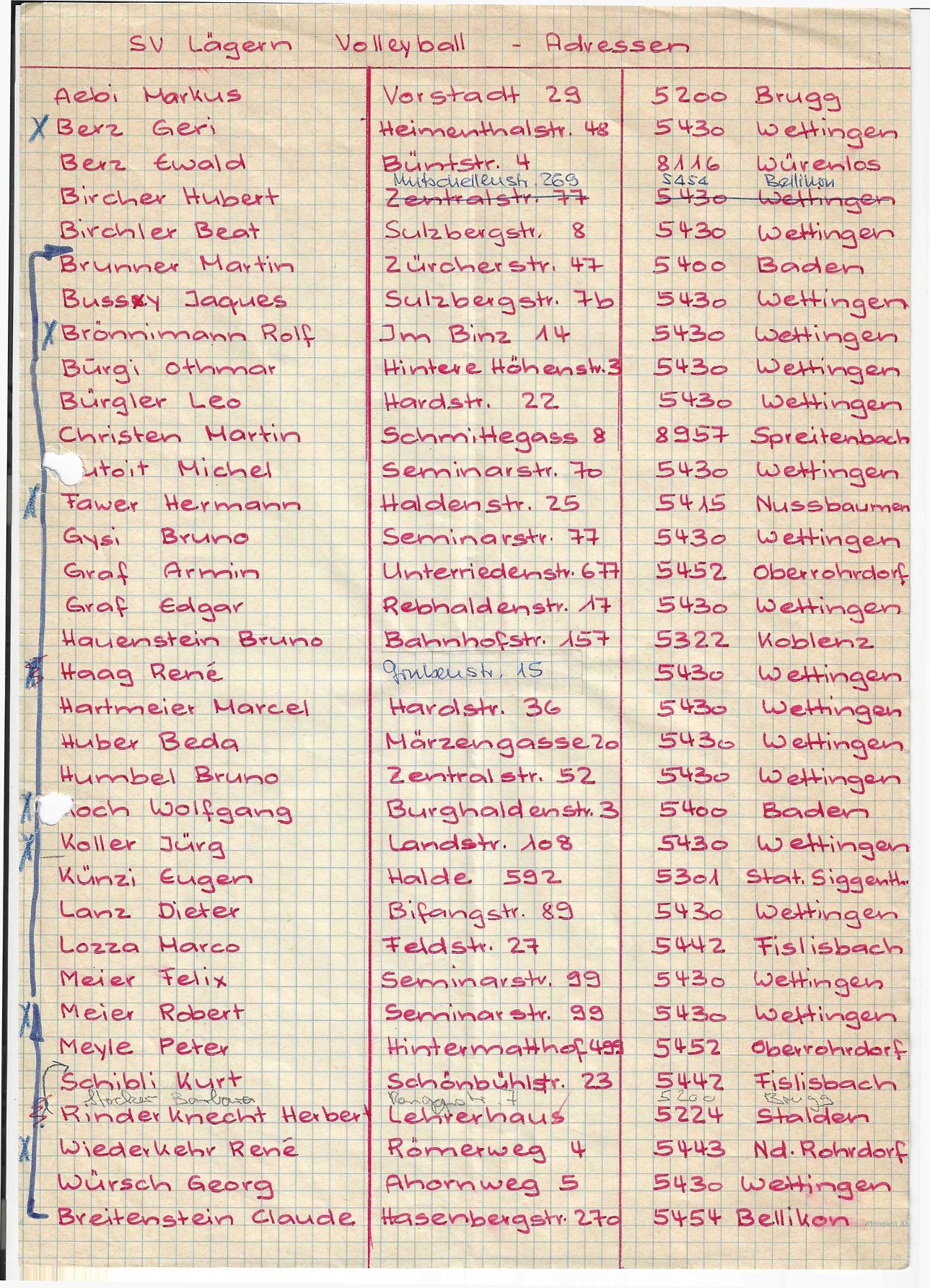 Mit der von Geri Berz 1978 initialisierten und 1979 definitiv durchgeführten Reorganisation des Vereins KTV Lägern Wettingen mutierte dieser zum «Gesamtverein» SV Lägern Wettingen, und es wurde der «Riegenbetrieb» aufgenommen. Die erste ordentliche «Riegenversammlung» der Volleyballriege SV Lägern Wettingen fand bereits am 21.04.1979 unter der Leitung von Edgar Graf statt.